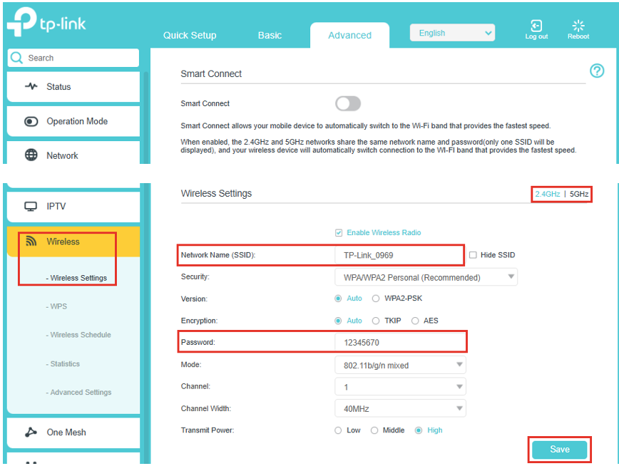 Change the Network Name (SSID) field and/or Password then Click Save.