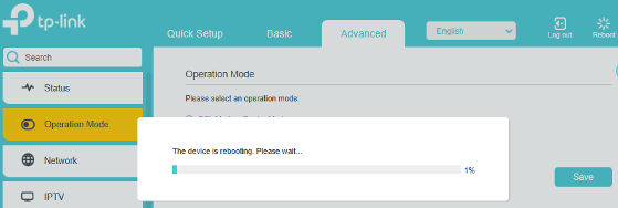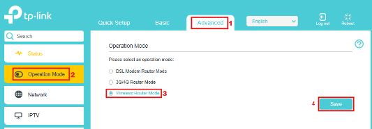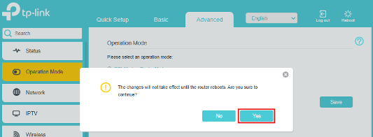 - Since this modem is in DSL Router mode by default, you may go to Advanced > Operation Mode. Then select Wireless Router Mode and Save. A popup then will show up advising router reboot will take place. Just click Yes. Wait until router finishes rebooting.