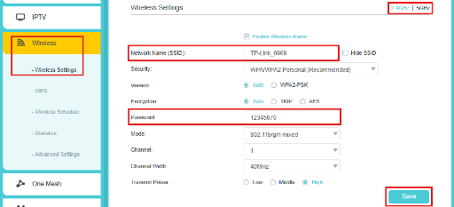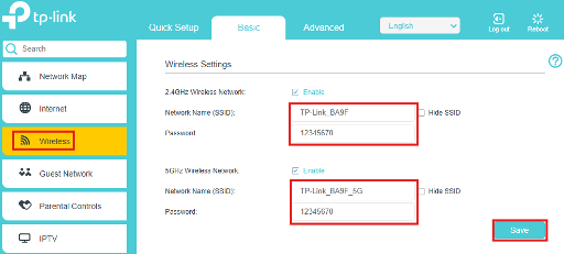 Change the Network Name (SSID) field and/or Password of either the 2.4/5 GHz or both then Click Save