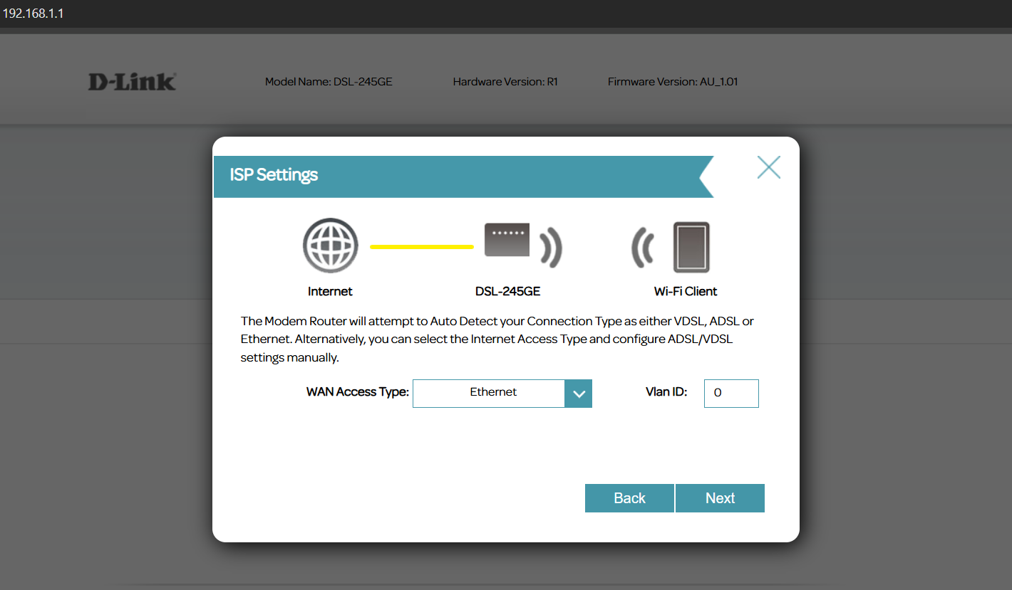 Under âISP Settingsâ, make sure to choose âEthernetâ for WAN Access Type and set VLAN ID to 0 for disabled VLAN tag, then go âNextâ.