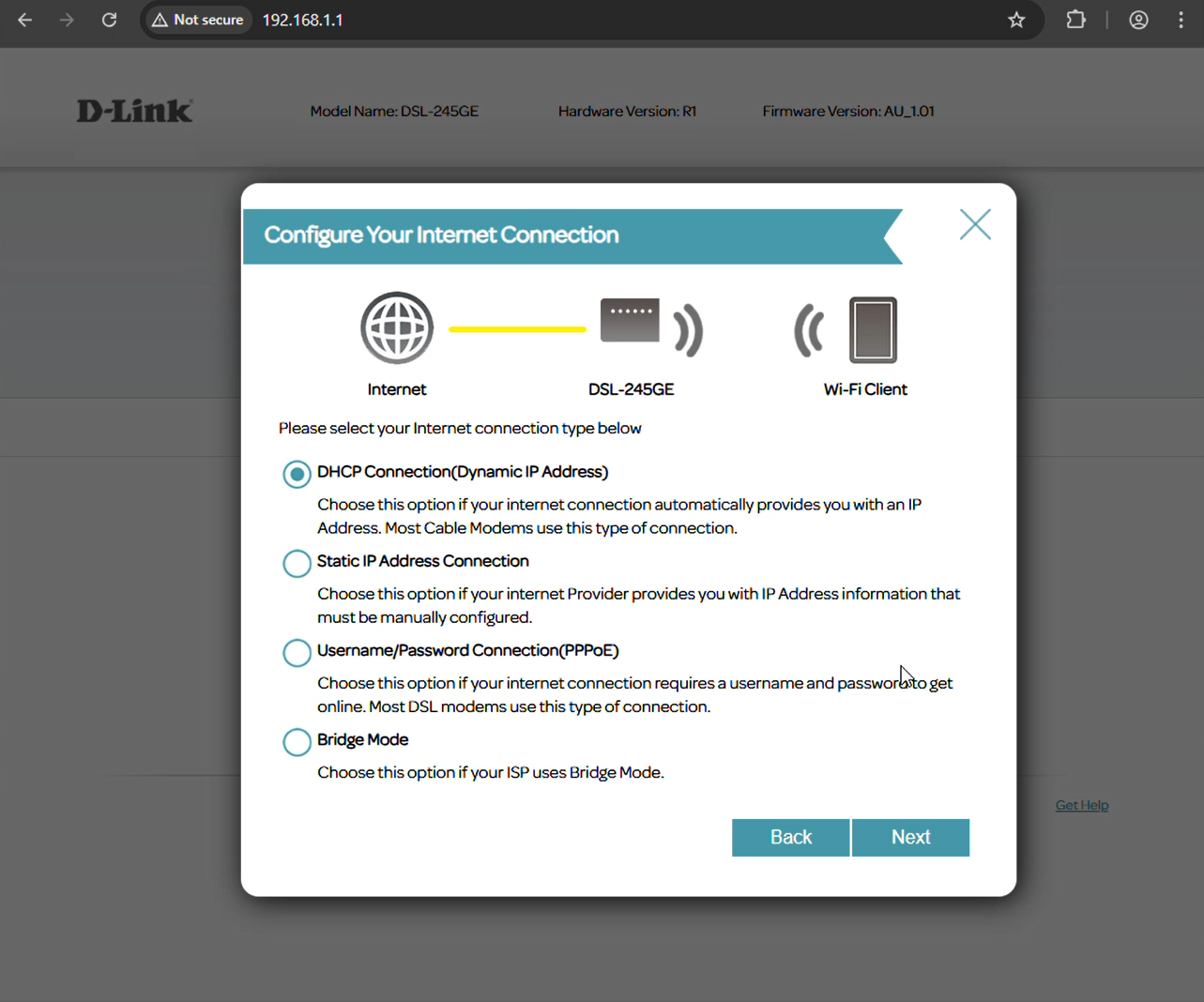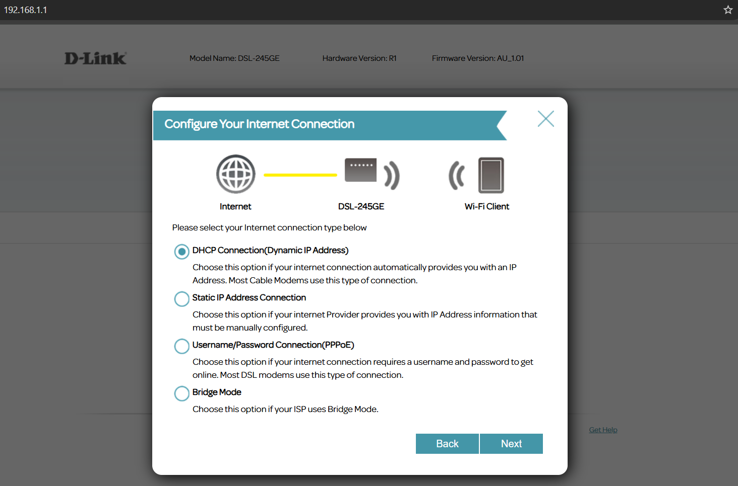 Under âConfigure Your Internet Connectionâ, select Internet connection type to âDHCP Connection (Dynamic IP Addressâ.